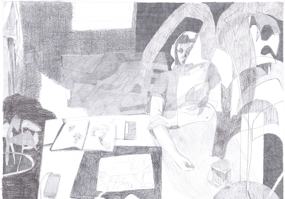 Die Kunst von Hella Stoletzki wurzelt in den zeichnerischen Erkundungen auf dem Papier. Wesentlich erscheint der Künstlerin diese Bewegung des Graphitstifts aus dem Handgelenk, also das freie Schwingen und Verdichten. Zeichnen offenbart sich hierin als Formergreifen, um offene Beziehungsgefüge zwischen Figur und Umraum auf der Fläche herzustellen. Das wechselt virtuos von präziser Gegenstandslineatur zu Flächen schaffenden Schraffuren, die mitunter Räumliches andeuten. Zwischen plastisch akzentuiertem Detail und Raum-Dekonstruktion kann wie beiläufig Ornamenthaftes hervorwachsen. Überlagerungen, Brüche und Verschmelzungen gehen eins ins andere. So erfährt der Bildraum nicht selten ungestüme Anverwandlung, geht mit der Figur eine Symbiose ein und wird damit für sie zur mentalen Metapher.