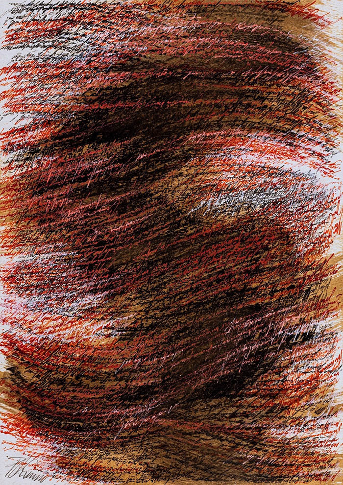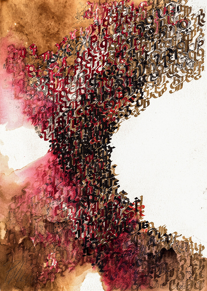 Schriftzügen, erfundenen Buchstaben, Zeichen, Schreibrhythmen, Kürzeln, Flecken und Färbungen.