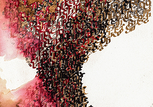 ins Bild und entfachen ihr Zwiegespräch. Zudem lassen sich überall Schriftzeichen, Sprachfetzen, Notate und historische Zitate in den Blättern entdecken, als