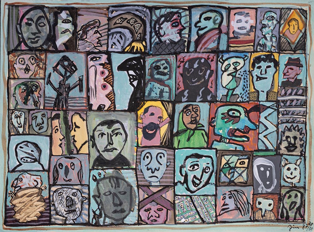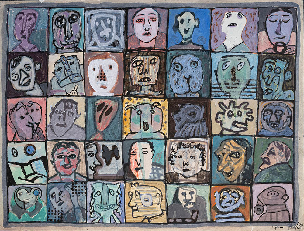 Die Besucher*innen der Galerie empfängt im unteren Raum ein umlaufendes Band von blauen, mit kleinteiligen Bildwaben übersäten Leinwänden. Der Titel „Wertes Publikum“: hier werden wir – Film- und/oder Malkunstnarren – auf uns selbst zurückgespiegelt. In der Unendlichkeit von Köpfen, Gesichtern, Visagen, Antlitzen und Masken kann jede*r Entdeckungen machen, gar sich selbst auf die Spur kommen.