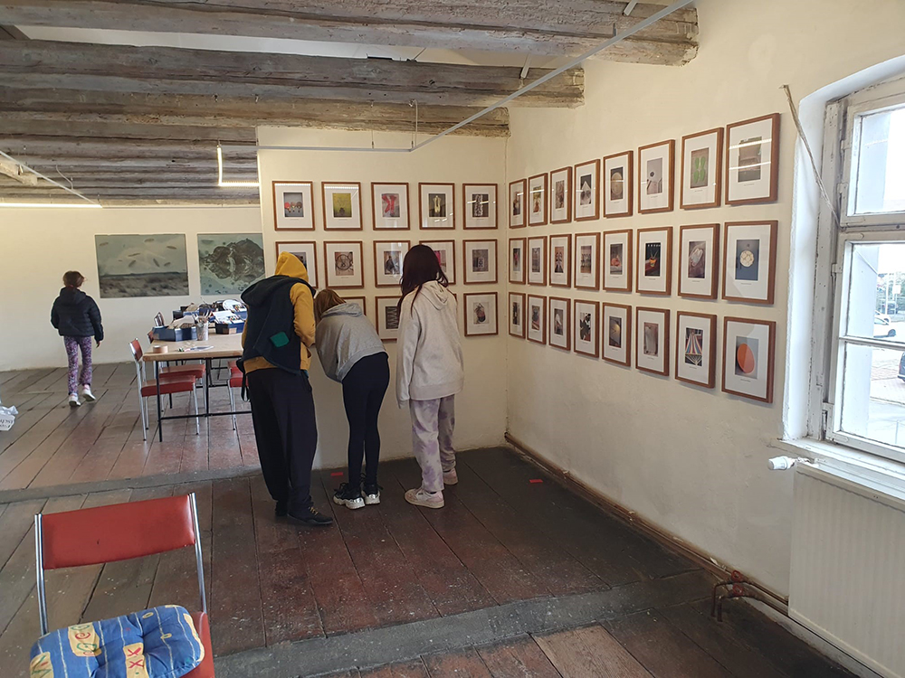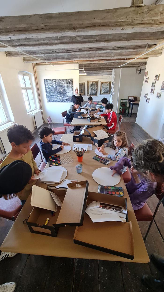 Die Kisten enthielten verschiedenste Materialien, darunter kreisrunde Malgründe, einen Einladungsbrief und Karteikarten zum Beschreiben. Es kamen erfreuliche viele, sehr fantasiereiche wie auch kritische Bilder und Karten zurück. Manches dieser „Weltbilder“ weckt Nachdenklichkeit, aber genauso tragen viele farbenfrohe Bilder Lebensfreude in die Räume. Sie alle werden derzeit in der Galerie Ma/rie/mix 23, in der Cottbuser Marienstraße 23, gezeigt. Begleitet von einigen Fotos, die den kreativen Prozeß dokumentieren.